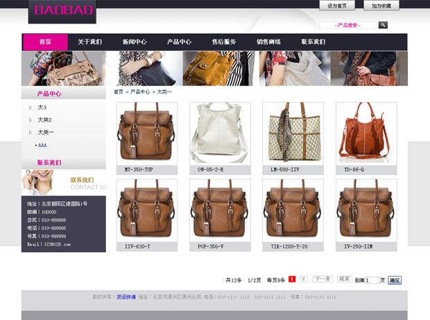该款精美女包销售店网站模板采用了高贵的黄色为基调设计,不同层次的渐变后使网站具有了高贵富有、温暖、希望的感觉。整体以图文分开排列的独特格局的设计,将产品图片幻灯方式置于导航条下方。即达到了最大限度展示产品的效果,又不缺少美感。