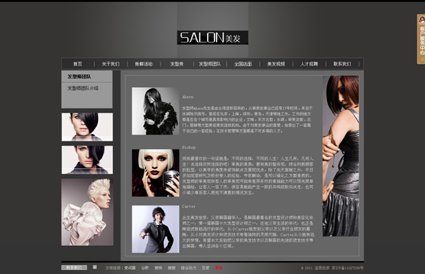该款模板采用个性张扬的黑色与灰色的组合作为网站的基调,首页主菜单包括了关于我们,新鲜活动,发型师团队,发型秀等内容,版面内更是运用了多组与美发相关的图片来尽显主题,整个网站的设计布局整体感出众,感染力和视觉冲击力非常的出众。这款模板具有设计非常新颖,独创力强的特点,而且,此模板的魅力也许就在于其独特新颖的设计,使其具有极强的吸引力,用了此模板,不仅使用户骄傲,而且,当有人拜访你的网站的时候也会跟你共鸣的。