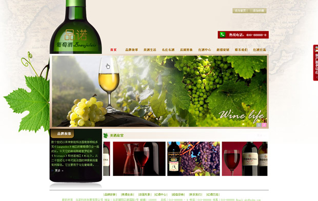 该款模板直接用一瓶葡萄酒贯穿于网站间,突出产品的效果,不言而喻,搭配着小清新的产品图片,整个页面给人舒适的感觉。这款模板具有设计非常新颖,独创力强的特点,而且,此模板的魅力也许就在于其独特新颖的设计,使其具有极强的吸引力,用了此模板,不仅使用户骄傲,而且,当有人拜访你的网站的时候也会跟你共鸣的。
