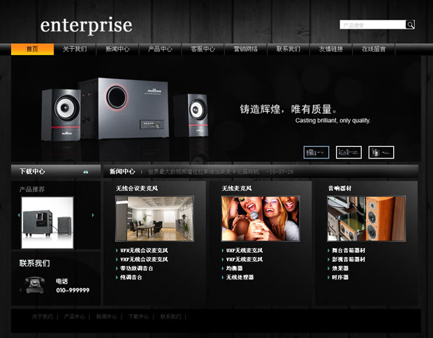 该款网站导航菜单采用时尚的黑色基调设计,衬托了产品的高品质性。独特的两行两列的设计格局,显得严谨,有条理。整版图文适当搭配很好的衬托出产品的特色,精美的产品图片网站更具有美感。