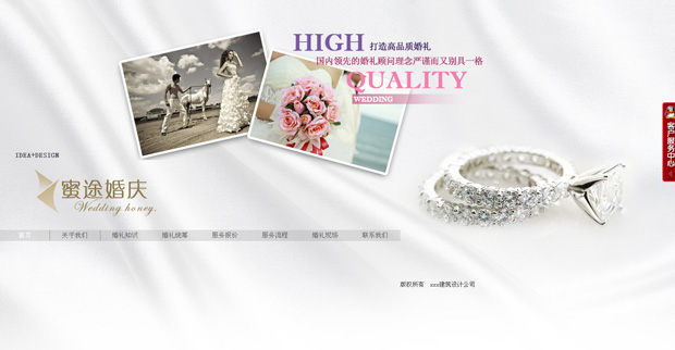 该款模板采用优雅的纯洁的白色作为网站的背景颜色,巧妙地搭配了钻戒,玫瑰花,礼服的图片,整个页面给人的甜蜜度不言而喻。整个网站的设计布局整体感出众,感染力和视觉冲击力非常的出众。没有过分跳动的色彩,没有繁复的结构,没有艳丽的装饰,有的,只是——大气感的表现形式,舒适合理的版块设置。