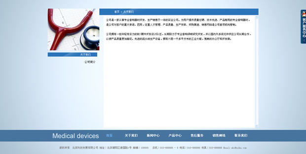 该款医疗器械销售公司网站模板采用了高贵的黄色为基调设计,不同层次的渐变后使网站具有了高贵富有、温暖、希望的感觉。整体以图文分开排列的独特格局的设计,将产品图片幻灯方式置于导航条下方。即达到了最大限度展示产品的效果,又不缺少美感。