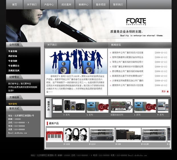 该款音响企业网页源码采用给人以沉稳感觉的灰白色为主基调,让浏览用户直观的感受到该企业的稳重。整体以图片和文字的详细描述相结合的方式,介绍该企业的文化、资讯以及产品,清晰地展现该企业的优势与特色,让浏览用户更安心放心地选购产品。