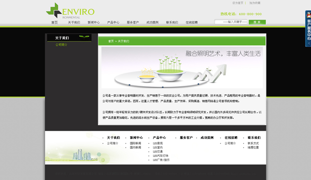 该款模板采用黑色作为网站的背景颜色,版面内适宜的插入了环保的绿色,更形象的表现了产品的特性。这款模板设计新颖个性,分块式的设计更加增添了模板的亮点,这样的设计更加的具有特色特点。整体是适量的文字描述与整齐的图片排列结合的布局,给浏览用户一目了然的视觉效果。