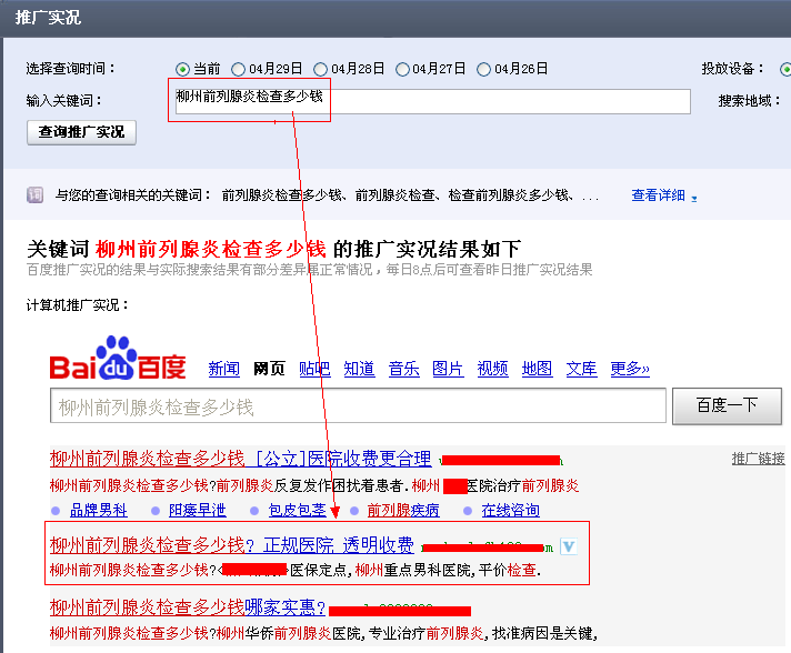在上图中我们可以看出我们的关键词“柳州前列腺炎检查多少钱”出价在9.23的价格时,此时的排名为第二,这时就可以估算出排在第二的网站的出价在9.23以上,那么就可以相应的提高价格,可以每次增加0.1元或者0.01元的方式来查看关键词的排名。一般我们在修改完价格后,在推广实况中是可以马上查看到推广网站的排名位置变化的,如果在推广实况中看到关键词排在了第一位,那么第一名的推广网站的百度竞价价格就是那个价格。